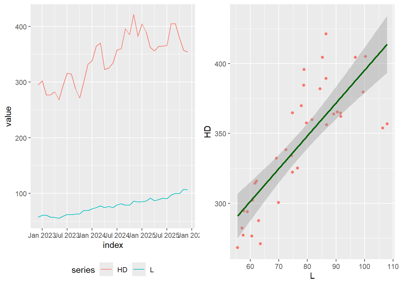 suppressWarnings({suppressPackageStartupMessages({library(tidyverse)library(dtw)library(TSclust)library(TSstudio)library(arsenal)library(quantmod)library(knitr)})})# Download two series from Yahoo Finance# Home Depot & Loewssymbols <-c("L", "HD")getSymbols(symbols, from =Sys.Date() -years(3), src ="yahoo")